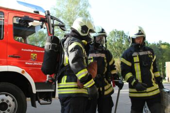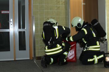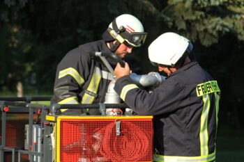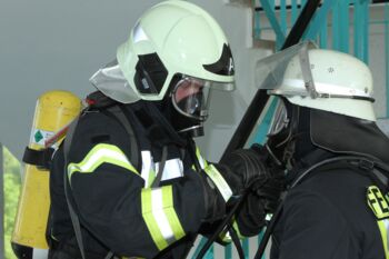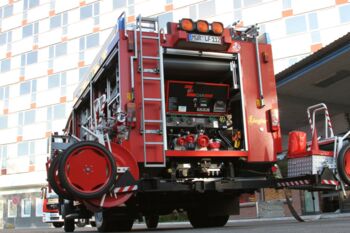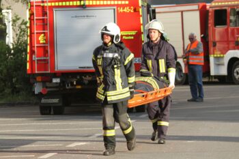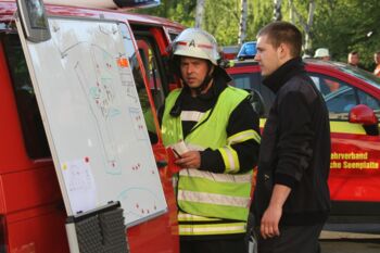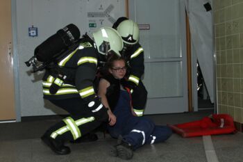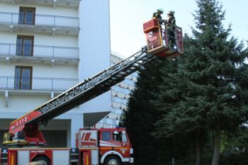 „Wir haben hier einen Brand im Ostflügel, Menschen sind noch im Gebäude“, erklärte Norbert Weißgerber die Ausgangslage und wies die eintreffenden Einsatzkräfte in ihre Aufgaben ein. Für die Freiwillige Feuerwehr Klink hieß das: Wasserversorgung von der Müritz sicherstellen. Weitere Löschfahrzeuge eilten auf das Gelände. Kameraden der Freiwilligen Feuerwehr Waren (Müritz) rüsteten sich mit schwerem Atemschutz aus. Schläuche in Tragekörben, Strahlrohre, Brechwerkzeug und ein Rauchschutz wurden in den Bereitstellungsraum unterhalb des vermeintlichen Feuers geschleppt. Natürlich hieß das: Treppen steigen. Dann der Einsatzbefehl: „Vor zur Menschenrettung!“ Zwei Trupps verschwanden im verrauchten Flur, der durch eine Nebelmaschine erzeugt wurde. Über eine Soundanlage wurden Menschenschreie und Feuerknistern eingespielt. Zimmer für Zimmer wurde durchsucht und die ersten „Verletzten gerettet“. Unterdes wurde fünf Etagen tiefer der Löscheinsatz vorbereitet. Mehrere Schlauchleitungen wurden verlegt. Pumpen in Stellung gebracht und die Wasserförderung über lange Wegestrecke simuliert. Zum Einsatz kam auch das Rettungsboot der Wassergefahrengruppe. Im Ernstfall würde dies Wasser an die Einsatzstelle pumpen können. Auf der Rückseite des Hotels wurde währenddessen die Drehleiter der Freiwilligen Feuerwehr aus Malchow in Stellung gebracht. „Menschenrettung über den zweiten Rettungsweg und anschließende Brandbekämpfung“ lautete hier der Auftrag.