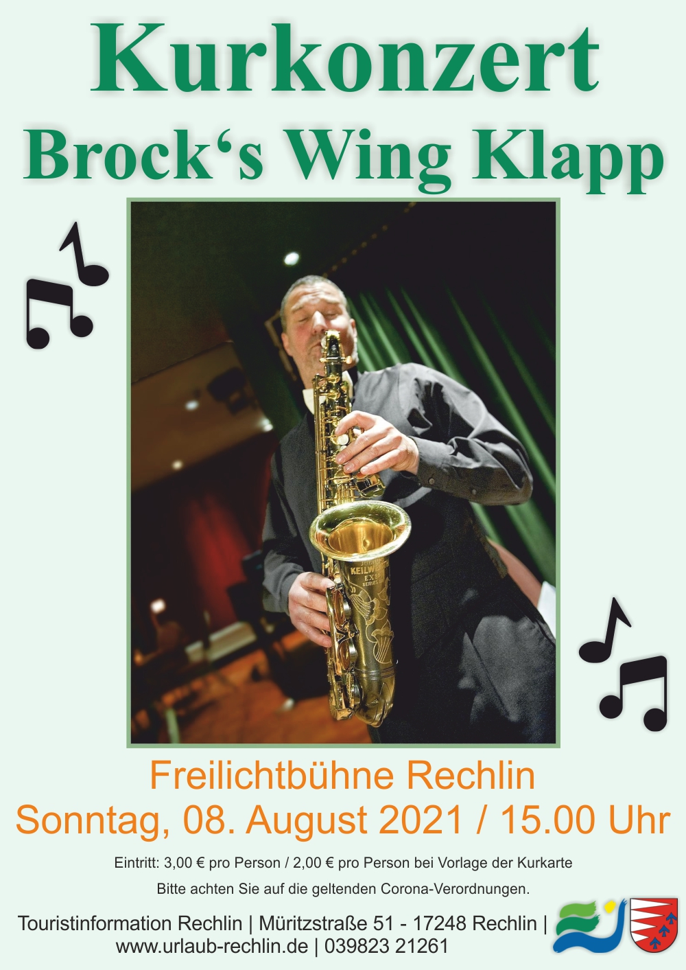 Am 08. August 2021 gibt es ab 15 Uhr das Kurkonzert mit Brock´s Wing Klapp. Der Eintritt kostet 3 Euro pro Person oder bei Vorlage der Kurkarte 2 Euro. Eintrittskarten und weitere Informationen gibt es in der Touristinformation Rechlin in der Müritzstraße 51 in Rechlin oder unter Telefon 039823 21 261.