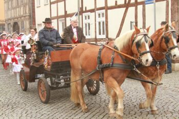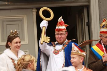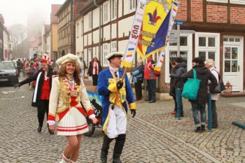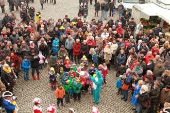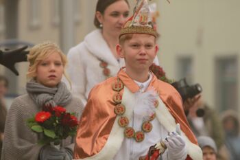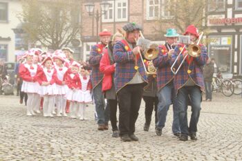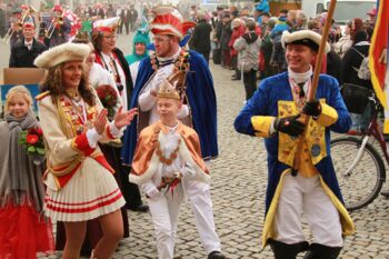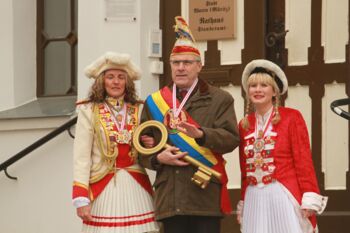 Ordentlich Farbe brachte heute der CCW in das trübe Waren (Müritz). Nachdem sich die Sonne ein sehr kurzes Stelldichein zum Morgen gönnte, verschwand sie am Vormittag hinter dichten Nebelschwaden. Auch um 11:11 Uhr war es diesig. Das war den Jecken vom CCW aber gänzlich egal. Farbenfroh, gut gelaunt und mit zünftiger Blasmusik zogen sie pünktlich auf den Neuen Markt ein. Während das närrische Fußvolk durch die Innenstadt marschierte, ließen sich die beiden Prinzenpaare traditionell königlich kutschieren. So erreichten Tobias I. und Cindy I. sowie Lysander und Noemi völlig entspannt trotz pausenlosen lächeln und winken das Warener Haus des Gastes. Hier wurde auch Bürgermeister Norbert Möller erwartet, doch der musste erst von zwei hübschen Funken aus dem historischen Rathaus geholt werden. Gelassen übergab Möller den Stadtschlüssel, denn „Die Kassen sind leer und es gibt viel zu tun. Entscheidungen zur Steinmole stehen beispielsweise an und der Haushaltsplan ist noch nicht fertig“, lachte Möller. Gut Lachen hatten auch die Gäste, die den Marktplatz trotz herbstlicher Kälte säumten, denn Putze Uschi plauderte aus dem Nähkästchen. So hörte man von einem Tächtelmächtel mit dem Bürgermeister – doch der nahm es wieder mal gelassen und amüsierte sich prächtig. Und Lachen soll bis zum Rosenmontag auch im Vordergrund stehen, denn die närrische Zeit ist in Waren (Müritz) eigeläutet worden.