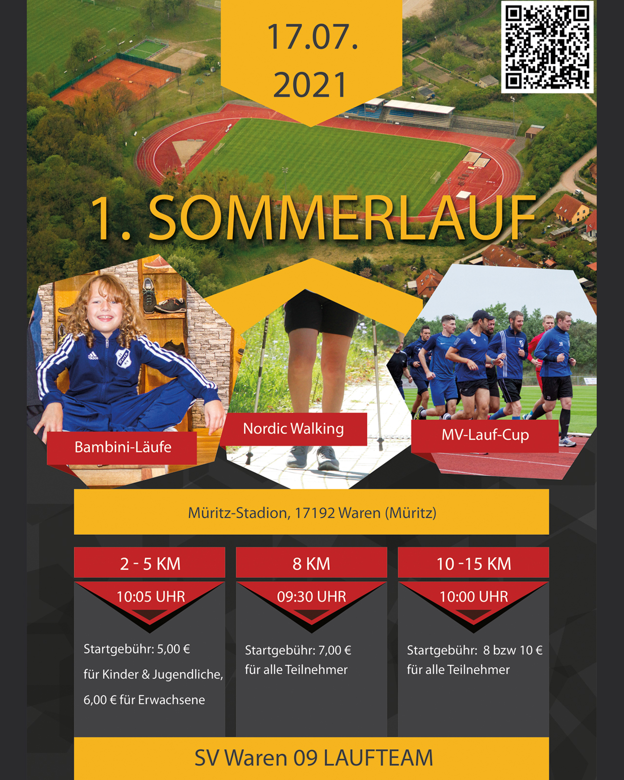 Mit der offiziellen Ausschreibung und der Freischaltung der Anmeldung über Tollense-Timing haben die Organisatoren des SV Waren 09 Laufteams eine weitere wichtige Etappe für den ersten Sommerlauf in Waren (Müritz) genommen. Der 1. Sommerlauf des SV Waren 09 wird am 17.07.2021 ab 09:30 Uhr gleich mehrere Laufstrecken sowie eine Nordic Walking Etappe für sportbegeisterte Teilnehmer von den Bambinis bis zum Seniorenalter anbieten. Gleichzeitig sind die Läufe auch bei der Cup-Wertung gelistet. Hier die aktuelle Ausschreibung und die Anmeldung über Tollense-Timing: