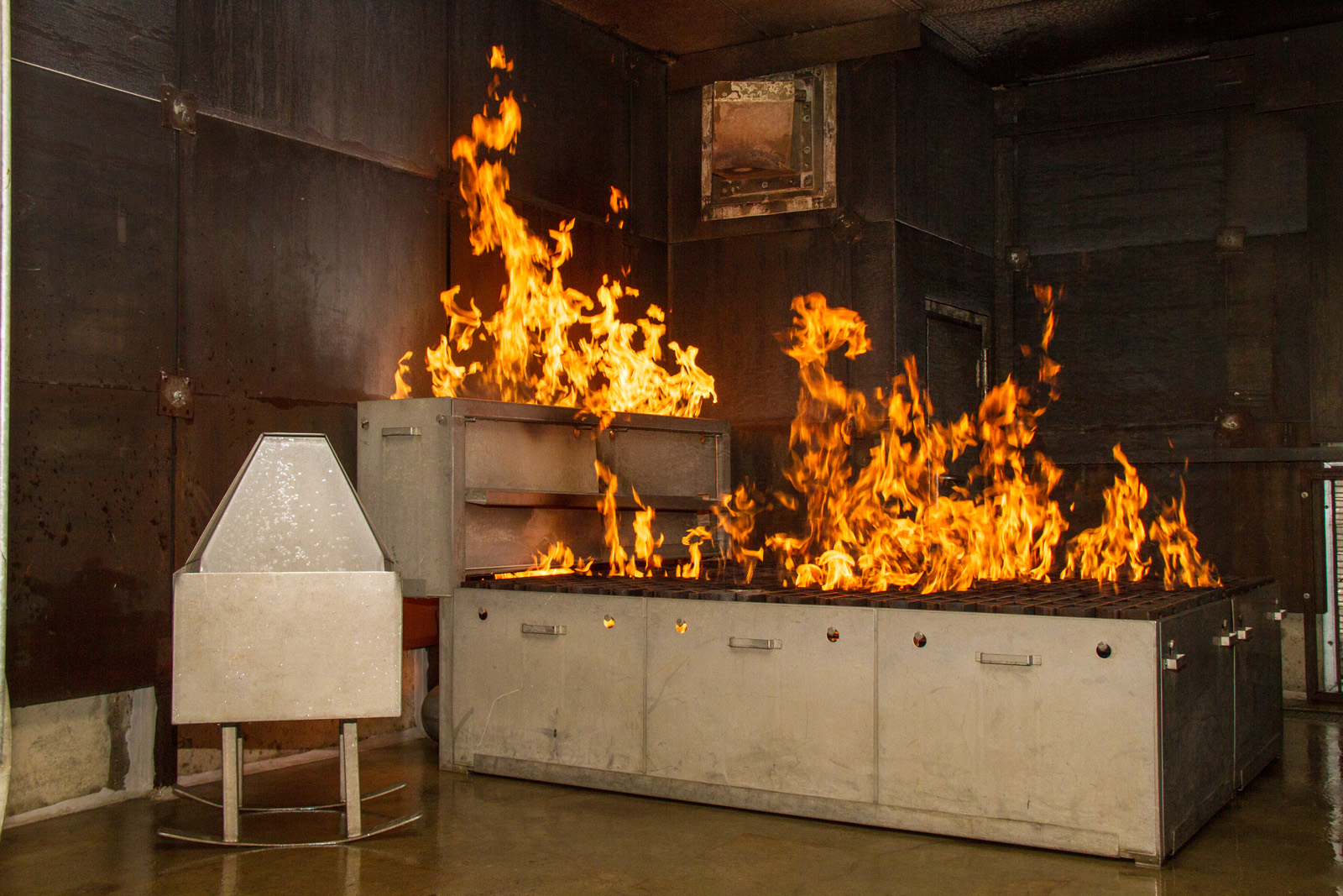 Eine kurze Einweisung zur vorliegenden Lage und der Brandtrainer überließ dem Angriffstrupp die ersten erforderlichen Maßnahmen. „Eigensicherung und die gezielte Menschenrettung stehen jetzt im Vordergrund“, erklärte René Dreier, der selbst Berufsfeuerwehrmann bei der Bundeswehr ist, den Auftrag. „Der Trupp geht mit Wasser am Strahlrohr vor und wird auch das Feuer in der Küche sehen. Doch sie müssen Ruhe bewahren und sich auf den vermissten Mann konzentrieren“, so der Brandtrainer, der den Trupp in die Flammen begleitete. Ein Wärmetest an der Tür und besonnenes Vortasten – Schritt für Schritt gingen die beiden jungen Männer unter schwerem Atemschutz vor. Über eine Wendeltreppe hinab in die Brandwohnung. „Dort liegt ein Rollator, hier muss er irgendwo sein“, verständigte sich der Trupp, der den entscheidenden Hinweis erkannte. Binnen weniger Minuten nach dem Alarm entdeckten die Retter den Dummy. Eine Meldung an den Einheitsführer und die Anforderung eines weiteren Trupps für den Löscheinsatz und schon galt es, die 70 Kilogramm schwere Puppe aus der Kellerwohnung über die Treppe in Sicherheit zu bringen. Das alles samt der eigenen schweren Ausrüstung, die um die 30 Kilogramm wiegt. Als ob dies nicht schon schwer genug wäre, schob René Dreier den Flammenregler noch etwas in die Höhe. „Hier haben wir jetzt über 120 Grad, das ist gut zur Wärmegewöhnung“, so der Feuerwehrmann, der unterstrich: „Das ist lediglich die mittlere Raumtemperatur, da geht noch was. Aber hier steht die Taktik im Vordergrund. Für das richtig heiße Feuer gibt es noch den Brandcontainer.“