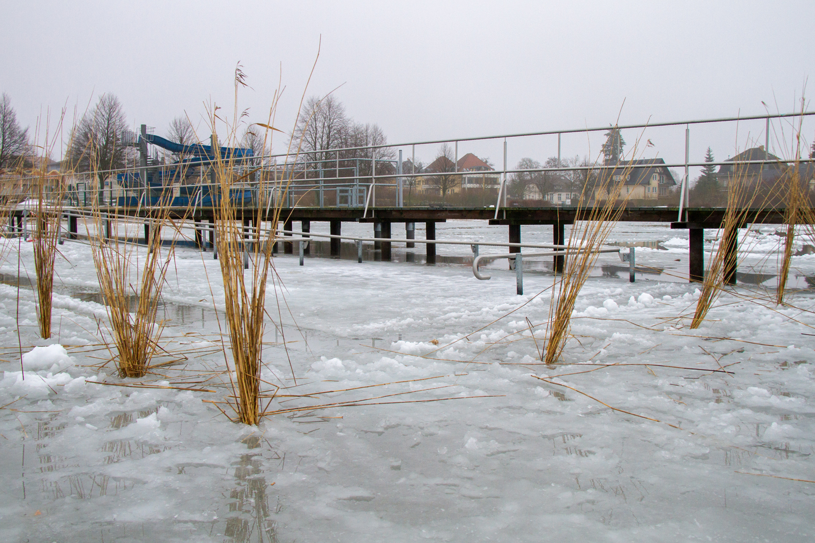 Auch wenn nach einem eiskalten Wochenende, verbunden mit Frost und Schneefall, dieser Tage das Tauwetter in der Mecklenburgischen Seenplatte einsetzte, wurde am Mittwoch der Warener Stadtbauhof zu einem Sondereinsatz an das Volksbad beordert. Gleich vier Mann rückten mit Motorsägen, Eispicken und Schilfbündel an, um entlang des Badestegs eine Schneise in das Eis zu sägen. „Sicher wird es bis zum Wochenende gut durchgetaut sein, aber wir müssen dennoch jetzt den Druck von der neuen Baderampe nehmen“, erklärte Bademeister Jörg Felgner. Gut 45 Meter ragt der barrierefreie Einstieg vom Ufer in die Müritz.