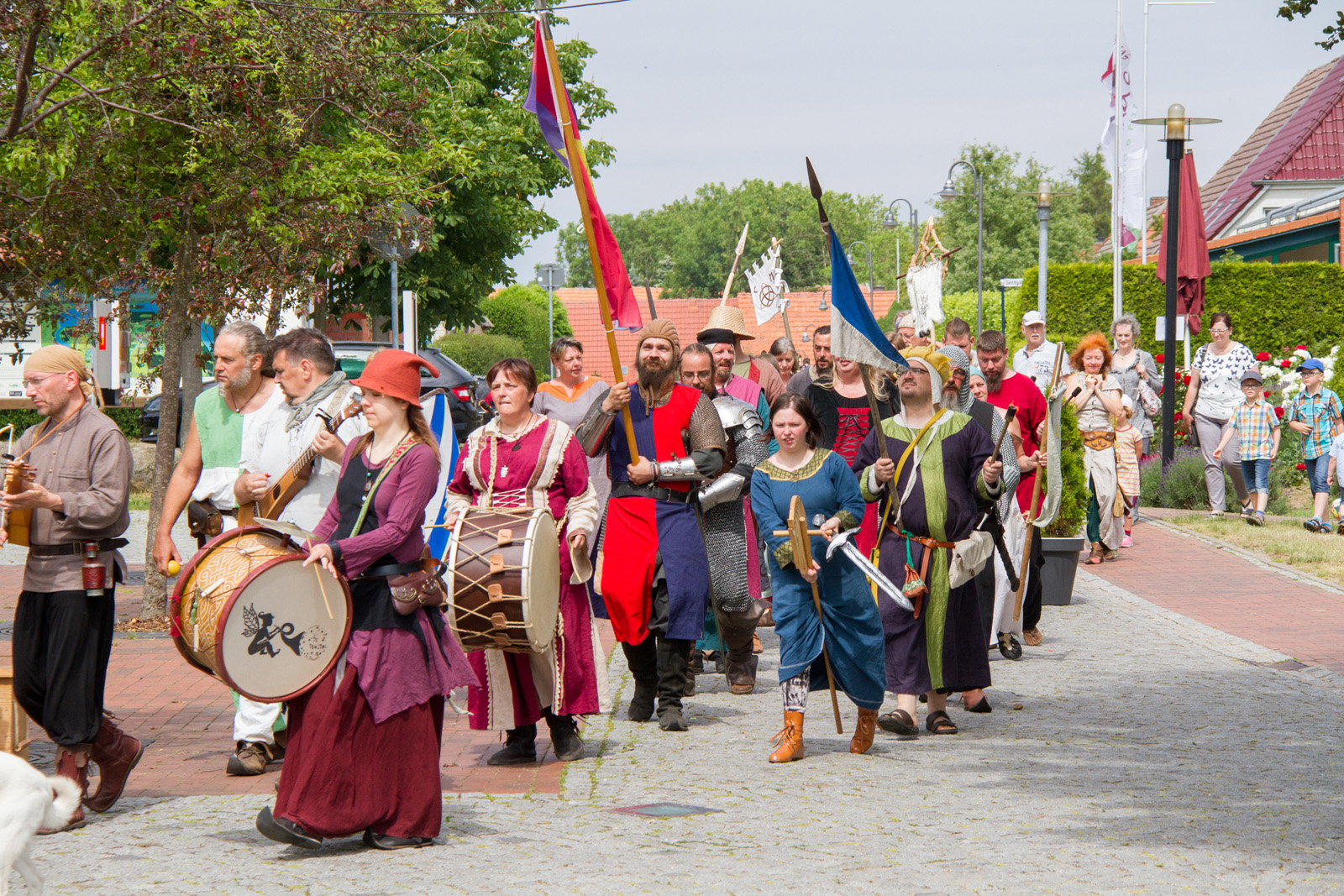 Für vier Tage unternahm das „Land Fleesensee“ am langen Pfingstwochenende wieder eine Zeitreise und lockte mit dem Mittelaltermarkt nach Göhren-Lebbin. Während es am Freitag noch sehr gediegen mit Feuerschalenromantik und leckeren Tinkturen aus der Taverne zu ging, startete der Mittelaltermarkt am Samstag ab 11 Uhr in die Vollen. Frauen und Männer vom Kindes- bis zum Seniorenalter aus verschiedenen Sippen präsentierten sich mit dem Lagermarsch und zelebrierten die Lagerweihe. Unter den staunenden Augen von zahlreichen Urlaubern und Einheimischen, die den Marktplatz von Göhren-Lebbin säumten, marschierten die Teilnehmer des Mittelaltermarkts in historischen Gewändern und machten neugierig auf das bunte Programm. Und das war wieder prall gefüllt.
