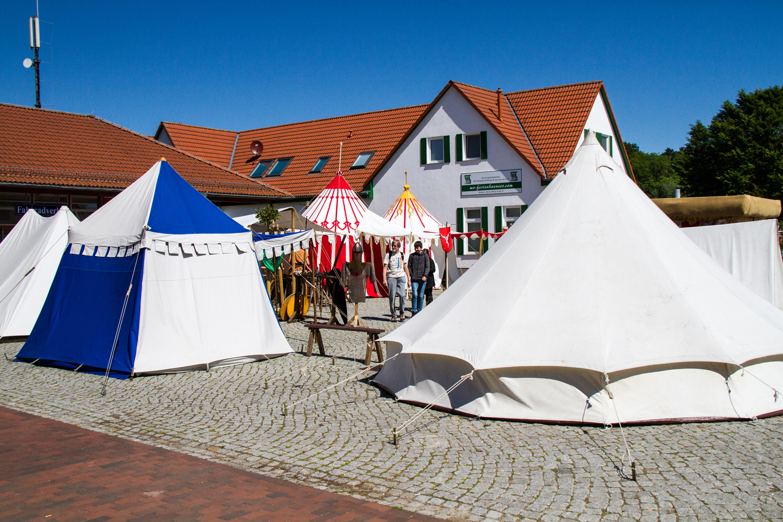 Dicht an dicht reihten sich die Programmpunkte zum Mittelaltermarkt in Göhren-Lebbin und bestes Pfingstwetter krönte die Veranstaltung am Fleesensee, die von Freitag bis Montag zahlreiche Besucher anlockte und begeisterte. Wie bunt und abwechslungsreich dieser Mittelaltermarkt werden wird, zeigten die Akteure bereits mit dem Lagermarsch und der Lagerweihe. „Wir haben hier vier verschiedene Lager mit gut 100 Beteiligten“, erklärte Doreen Muster von der Kur- und Tourismus GmbH Göhren-Lebbin. In mediävalen Kostümen schritten die Frauen und Männer durch die Zeltstädte und präsentierten sich den ersten neugieren Besuchern. Und auf die wartete altes Handwerk, Kunst, Gaukelei und jede Menge Abwechslung. Während „Fortuna Musica“ liebliche Musik über den Marktplatz trällerten, zeigten Gaston Adler und Carsten Guth vom Förderverein Brauchtumspflege „Lilienbund“, wie Schmiedekunst und Drechslerei vor hunderten von Jahren zelebriert wurden. „Der Blasebalg schürt das Feuer konstant an“, erklärte Schmied Gaston Adler und formte unter schweren Hammerschlägen das Eisen.