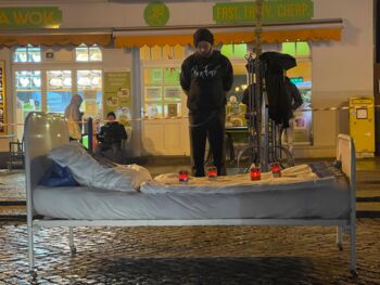 Und der Beifall riss nicht ab. Denn mit Martin Blumentritt trat jetzt nicht nur ein bekannter Musiker aus Mecklenburg-Vorpommern ans Mikrofon, sondern auch einer der Organisatoren der Demonstrationen von Wolgast. Doch Martin Blumentritt startet nicht mit großen polarisierenden Reden, sondern mit einer Schweigeminute. Vor einem symbolischen Pflegebett hielten der Musiker und die Demonstranten inne und mahnten, wer pflegt die Kranken und Pflegebedürftigen mit Einführung der Impflicht in den Pflegeberufen. Nach kurzer Stille nahm Martin Blumentritt Fahrt auf und zog seine Zuhörer schnell in seinen Bann.