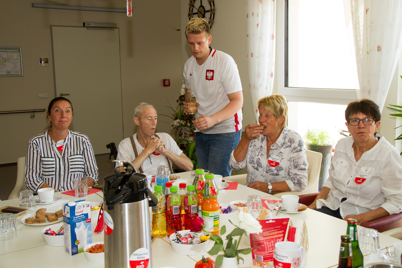 „Ich war in meinem Freiwilligen Sozialen Jahr in Polen und habe dort in der Altenpflege gearbeitet“, erklärte Michael Ellert. „Hier lernte ich auch meine Freundin kennen und lieben und blieb schließlich ein weiteres Jahr“, so der examinierte Pflegefachmann. Auf die Frage, ob denn schon jemand in Polen zu Besuch war, gab es regen Zuspruch. So konnte ein Bewohner zahlreiche Urlaubsreisen in das Nachbarland vorweisen und punktete bei der geographischen Exkursion. Das spornte auch seine Mitbewohner sowie die Angehörigen an, die gemeinsam so manche Wissenslücke schließen konnten. Aber nicht nur theoretisch sollte der polnische Nachmittag zelebriert werden. „Ich habe euch auch viele leckere Sachen zum Probieren mitgebracht, die ihr auch alle kosten solltet“, zeigte Michael Ellert. Frisches Brot mit verschiedenen Pasteten, kleine Cabanossi, süße Schlemmereien und diverse regionale Getränke reihten sich dicht an dicht auf der gedeckten Tafel. Unterdes wurden noch in der Küche mit Fasolka po bretonsku eine deftige Suppe und die Golabki, eine Variante der Kohlroulade, auf dem Herd erwärmt sowie eine geschmackvolle Bratwurst auf dem Balkon gegrillt. „Das ist ja alles lecker“, staunten die Gäste, die nach und nach jeweils kleine Häppchen probierten und so einen Nachmittag mitten im Leben und das im Hospiz erlebten.