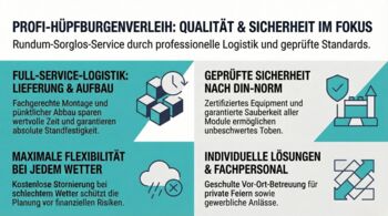 Schnelligkeit bei der Organisation darf niemals zulasten der Sicherheit gehen. Kinder gehen beim Spielen an ihre körperlichen Grenzen, weshalb das Material absolut belastbar sein muss. Gepflegtes Equipment nach aktuellen DIN-Normen bildet die absolute Grundvoraussetzung für jedes Fest. Sichtbar intakte Nähte, robuste Gebläse und saubere Planen geben Eltern das gute Gefühl, dass ihr Nachwuchs geschützt ist. Anbieter, die Sauberkeit als echtes Qualitätsmerkmal definieren, heben sich deutlich ab. Wenn sich die Kinder völlig frei und sicher bewegen, entspannt sich automatisch die gesamte Atmosphäre der Feier. Ein improvisiertes Fest bedarf keines monatelangen Vorlaufs. Mit zuverlässigen Partnern an der Seite wird aus einer fixen Idee ein Tag, an den man sich noch lange mit einem Lächeln erinnert.