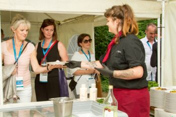 Das Wetter passte und 340 Frauen und Männer pilgerten am Sonnabend gegen 15 Uhr zielsicher zur Warener Kietzbrücke. „Lassen sie und auf einen schönen Spaziergang anstoßen und lassen sie es sich schmecken“, wurden die Gäste der Warener Kulinale begrüßt. Vor ihnen lagen sieben Gänge eines schmackhaften Menüs, auserlesene Weine und ein vier Kilometer langer Spaziergang entlang des Müritzufers. Und den passenden Start gab es im schattigen Park am Fahrgastanleger der Kietzbrücke. Mit Variation vom Hauskaninchen mit Blattspinat und geräuchertem Roastbeeftatar auf Feldsalatmousse an einem Konfit von roten Zwiebeln eröffnete das Müritz Catering das Mahl der Warener Kulinale. Begleitet von einem feinherben Riesling gaben die Gäste schnell in Stimmung und regen Gespräche zwischen Alteingesessenen und Neulingen des „Genusswanderns“ sorgten für einen unterhaltsamen Start.