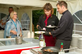 Halbzeit und die Sonne lachte bei schwülwarmen 25 Grad Celsius. Da kam die schattige Etappe entlang des Müritzufers sehr gelegen. Nun waren die Koche und Servicekräfte der Villa Magarete gefragt. Feurige Brühe von Schwein und Huhn mit Udon und Garnele standen auf dem Menü und ein Spätbrugunder Rosé begleitete diesen Gang. Knapp zehn Minuten entfernt hatte Carsten Leddermann Kalbsröllchen an Spargel, Pflaume, Spitzkohl und Karotte für die Wandergruppe vorbereitet, die sich ein Glas Salvador XII Tempranillo gönnten. Endspurt, denn das Seehotel Ecktannen wartet mit dem verbleibenden Gang. Sirko Schönbeck und sein Team servierten flambierte Schokoravioli an karamellisiertem grünen Spargel und Erdbeer-Basilikumeis. Colombelle Blanc Colombard und Sekt Schloss Rheinach füllten die Gläser und rundeten die Warener Kulinale ab. Mit der Blau-Weissen-Flotte wurde eine kostenfreie Überfahrt zum Stadthafen realisiert und 340 gesättigte Gäste konnten auf sieben schmackhafte Gänge und einige Gläser Wein zurückblicken. Fünf Euro jeder verkauften Eintrittskarte stiftete der Rotary Clubs Waren (Müritz) als Initiator für das Projekt „Junges Morizanermahl“.